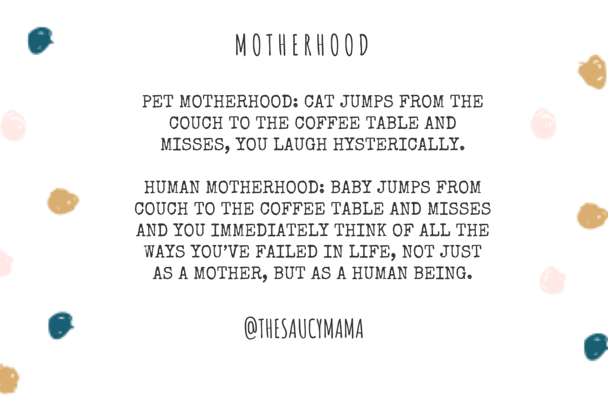 The comparison between a pet and a baby negates what it actually means to be a mother. I know some people go the extra mile for their pets, but I promise you, it’s not the same as staying up all night making sure your baby stays hydrated because he has a stomach bug and has redecorated his crib with the contents of his stomach…twice.